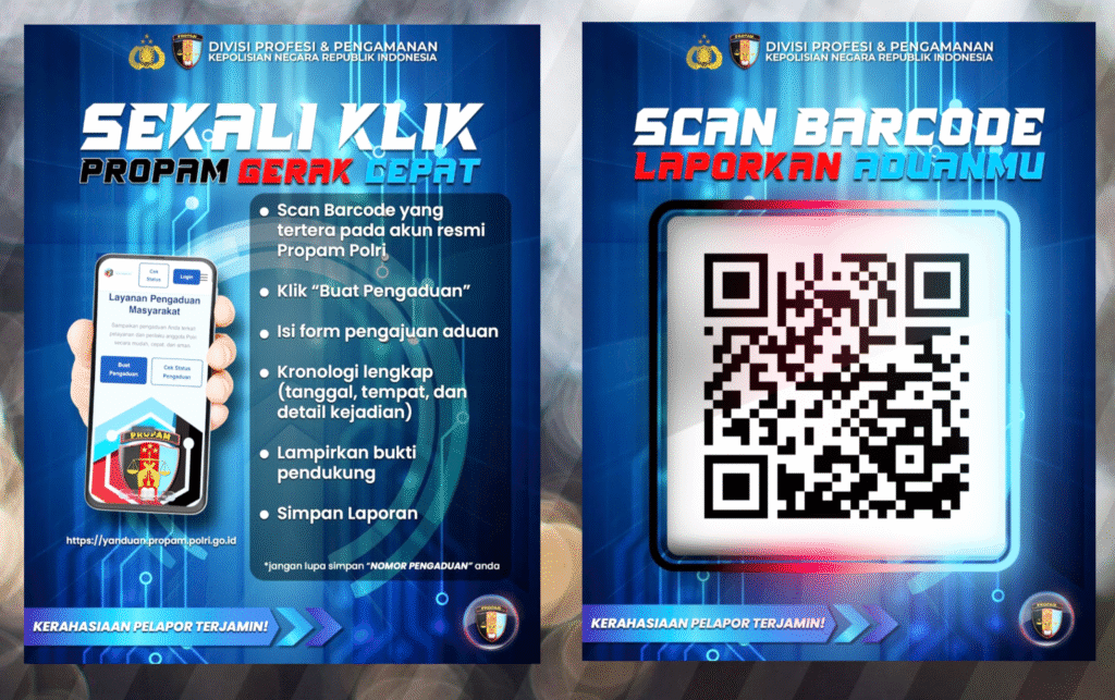 Masyarakat cukup memindai QR Code yang telah disebar pada platform resmi Propam Polri, atau mengakses langsung situs layanan pengaduan melalui: yanduan.propam.polri.go.id Di halaman tersebut, pelapor dapat mengisi formulir pengaduan secara online dan mengunggah bukti pendukung jika diperlukan.