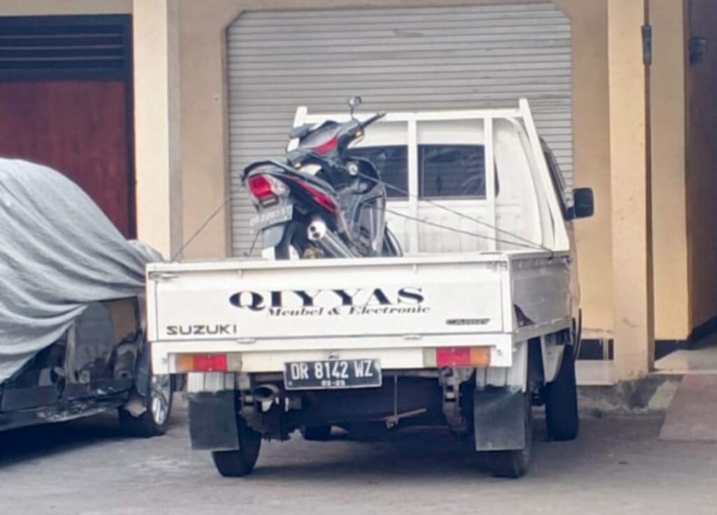inilah barang bukti mobil pick up yang disita Satlantas Polres Lotim . Namun hal ini bertentangan dengan pengakuan keluarga korban yang mencurigai bahwa, mobil pick up yang dikendarai supir toko elektronik, berwarna hitam.